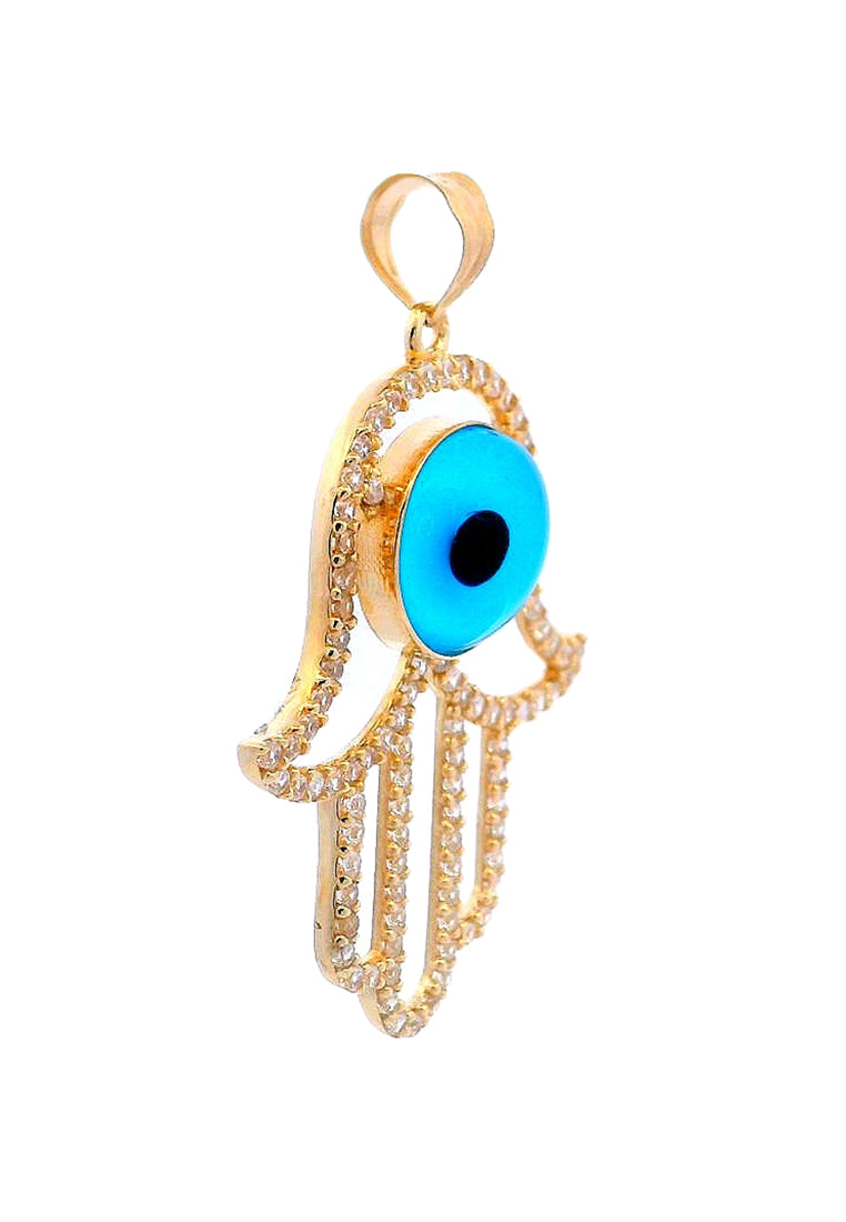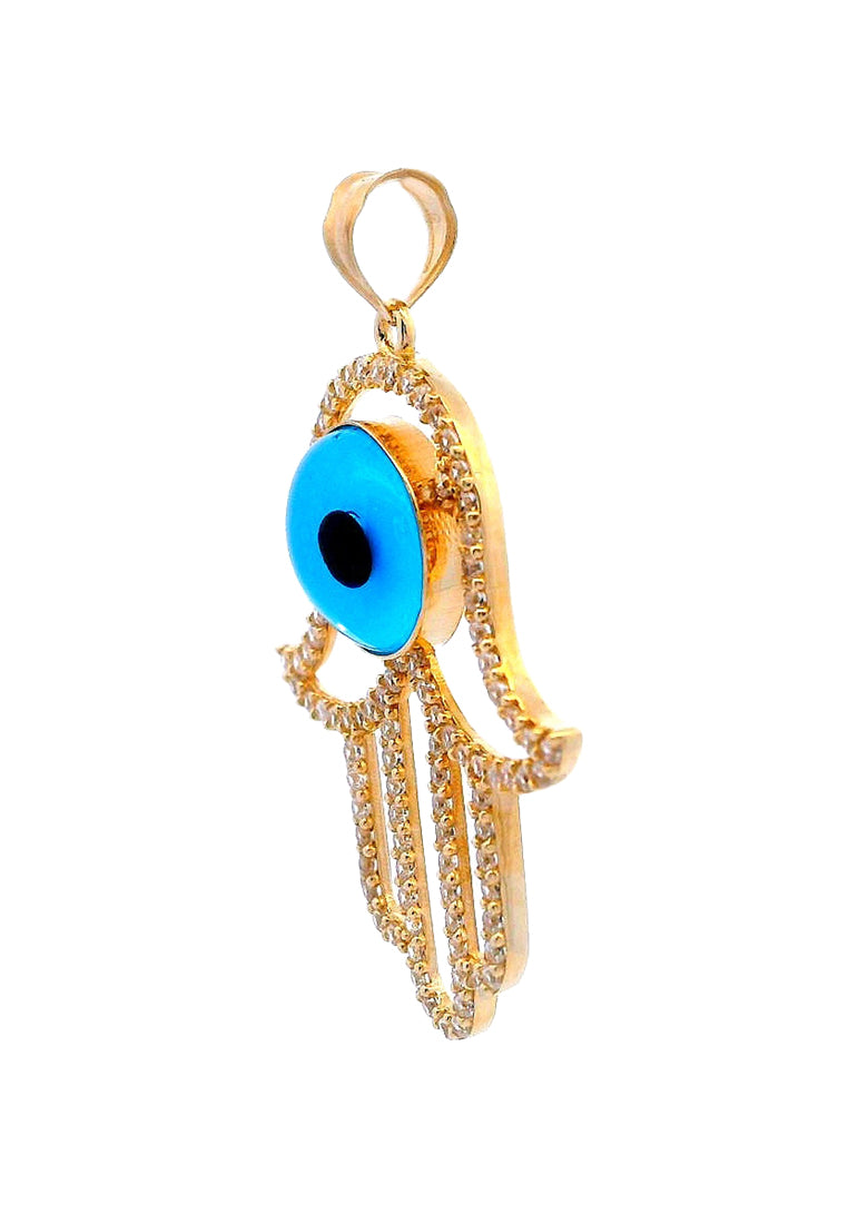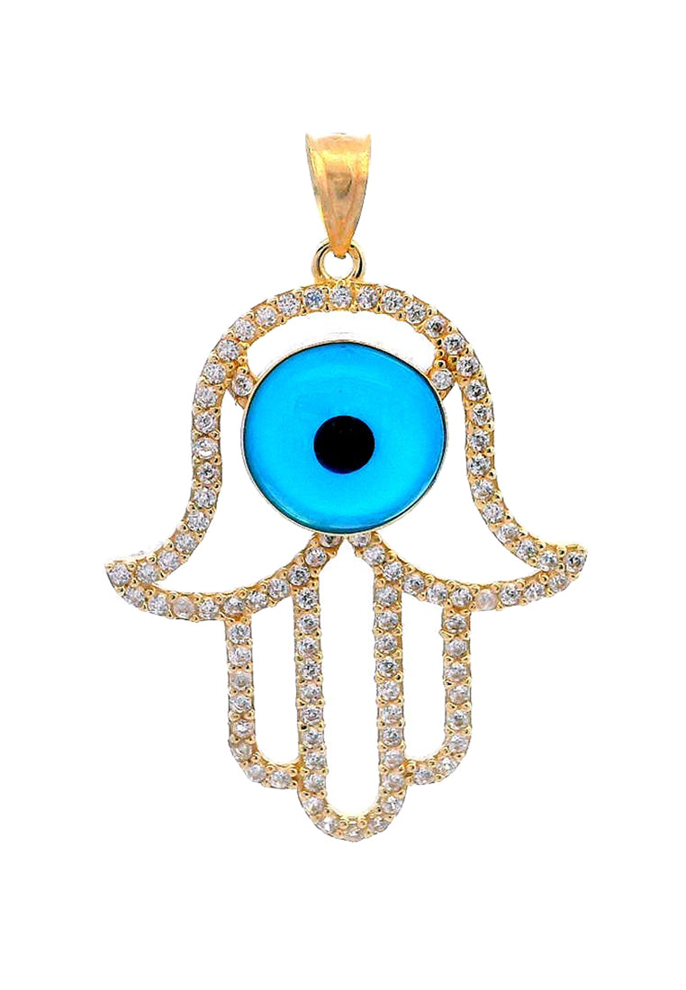 Product Code: GP-9752Product Category: Gold PendantGold Karat: 14KGold Color: Yellow GoldDescription: Evil eye & hamsa hand design w/ light blue, black colored glass & High Quality Zircon Stone Type: Light blue, black colored glass & High Quality Zircon Item Size: 23mmx36mmx5mmApprox Weight: +/- 2.45 grams